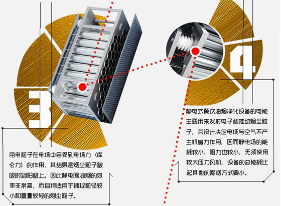 1、 油煙凈化器的電場使用圓筒蜂窩式結(jié)構(gòu),使靜電場能均勻地達(dá)到最大的平均電場強(qiáng)度,極大的增加了電場凈化面積,使電場與油煙粒子結(jié)合作用的時間更長,從而決定了設(shè)備具有極高的除油煙效率。